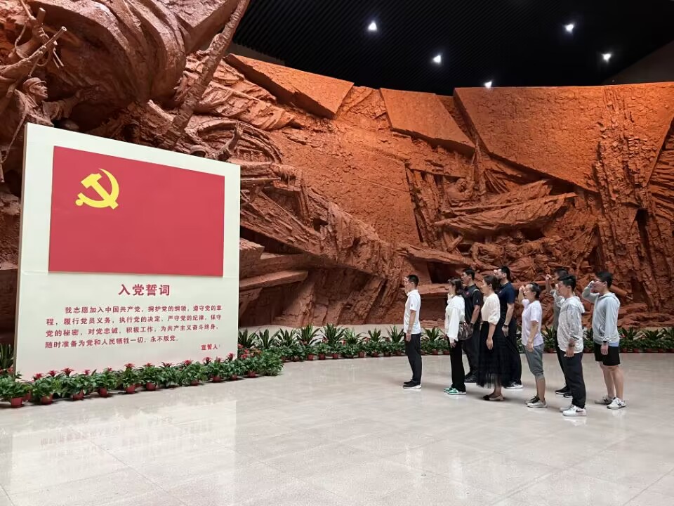 在一楼大厅,面向鲜红的中国共产党党旗,支部书记汪辉领誓,其他教师党员高举右拳,重温入党誓词,表达忠诚于党、忠诚于人民、忠诚于马克思主义的坚定信仰,展示了矢志不渝、接续奋斗的坚定信念,彰显了担当作为、奋勇前进的坚定信心。