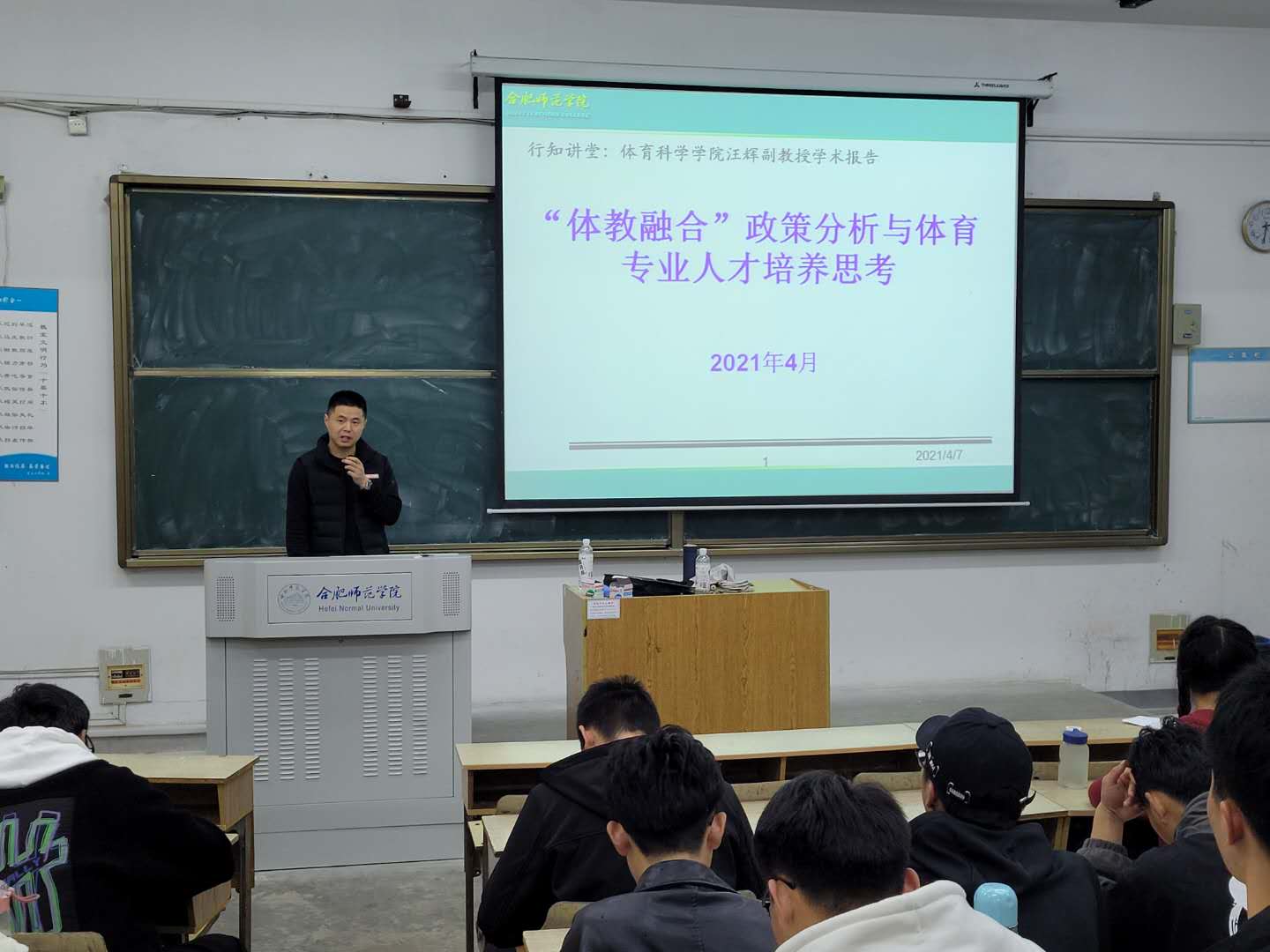 本网讯 4月7日下午,“行知学堂”学术报告在锦绣校区博约楼111教室举行。本场报告由william威廉中文官网汪辉副教授主讲,主题为“‘体教融合’政策分析与体育专业人才培养思考”,体育教育、运动训练、舞蹈表演和运动康复专业近200名员工聆听了报告。
