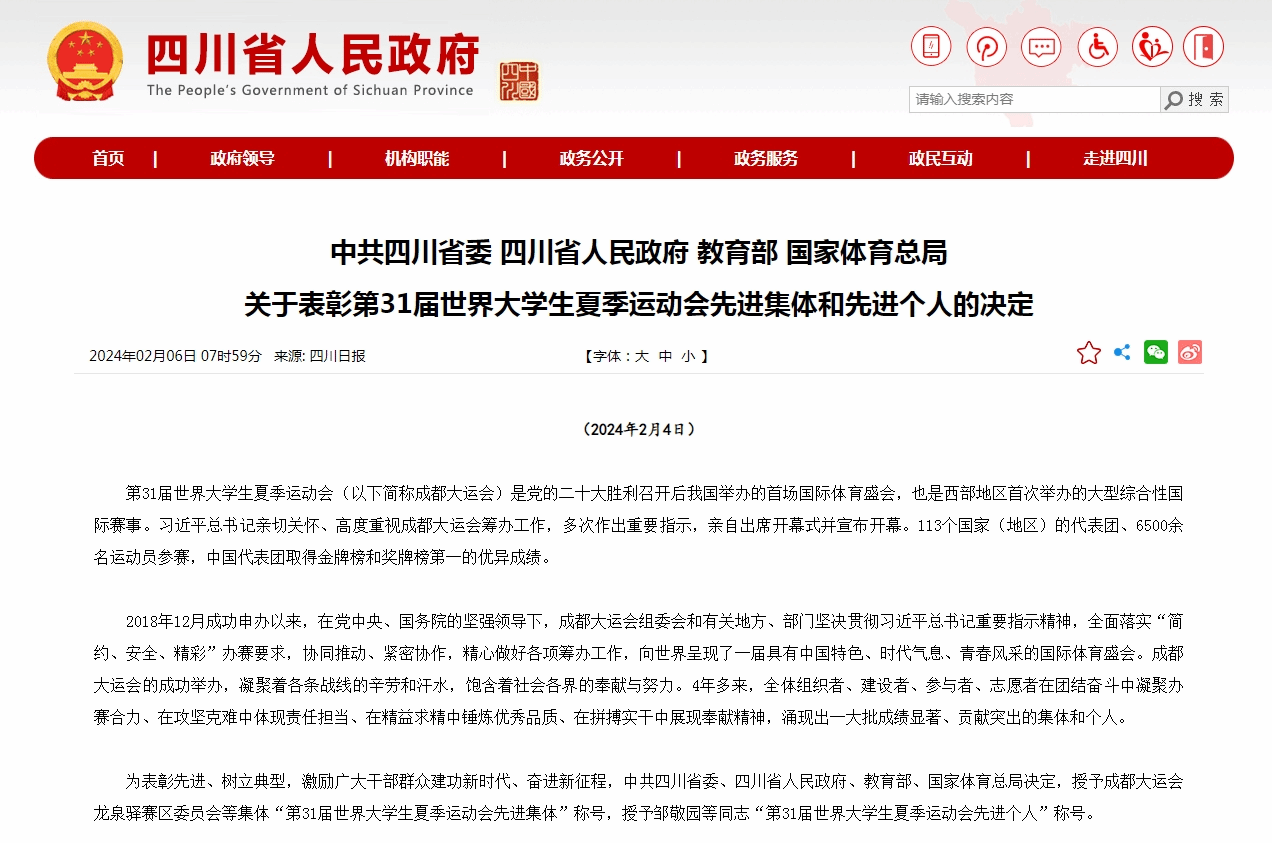 为表彰先进、树立典型,激励广大干部群众奋进新征程、建功新时代。2月4日,中共四川省委、四川省人民政府、教育部、国家体育总局联合印发《关于表彰第31届世界老员工夏季运动会先进集体和先进个人的决定》,公司william威廉中文官网荣获“第31届世界老员工夏季运动会先进集体”,2021级体能训练专业胡凯被授予“第31届世界老员工夏季运动会先进个人”称号。