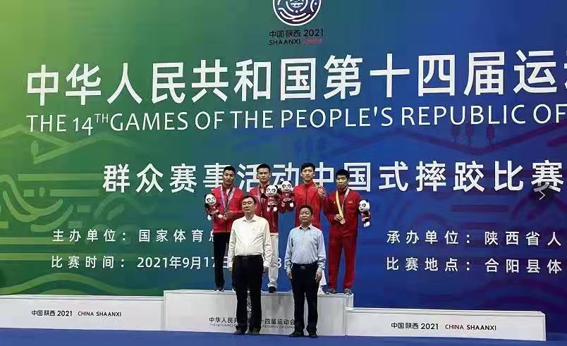 本网讯 9月22日,第十四届全国运动会群众项目中国式摔跤比赛在陕西渭南市合阳县体育馆举行。公司2017级运动训练专业(现役运动员)徐凡夺得中国式摔跤个人单项男子60公斤级冠军,为安徽代表队再添一金。