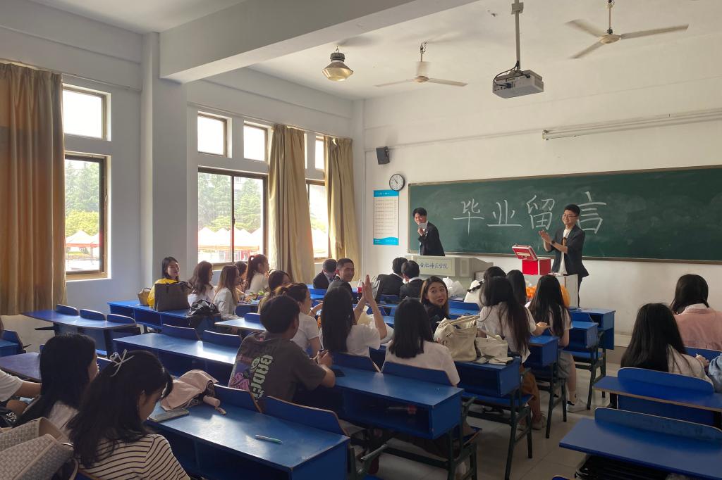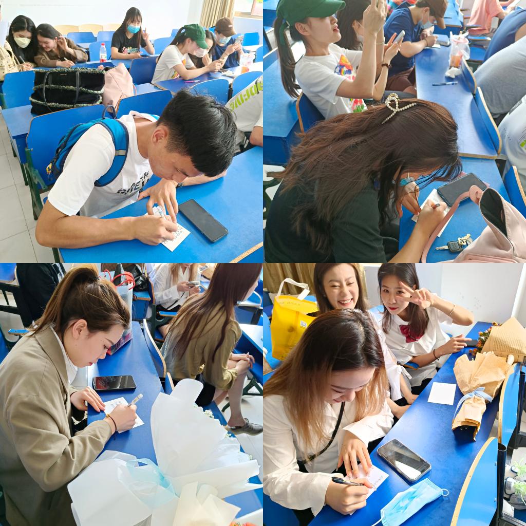 活动中同学们在定制的明信片上写下自己的毕业留言与毕业寄语,签上名字之后投入抽奖箱,辅导员组织大家依次上台抽取一张寄语明信片,每个同学都能随机抽到一张毕业寄语明信片。