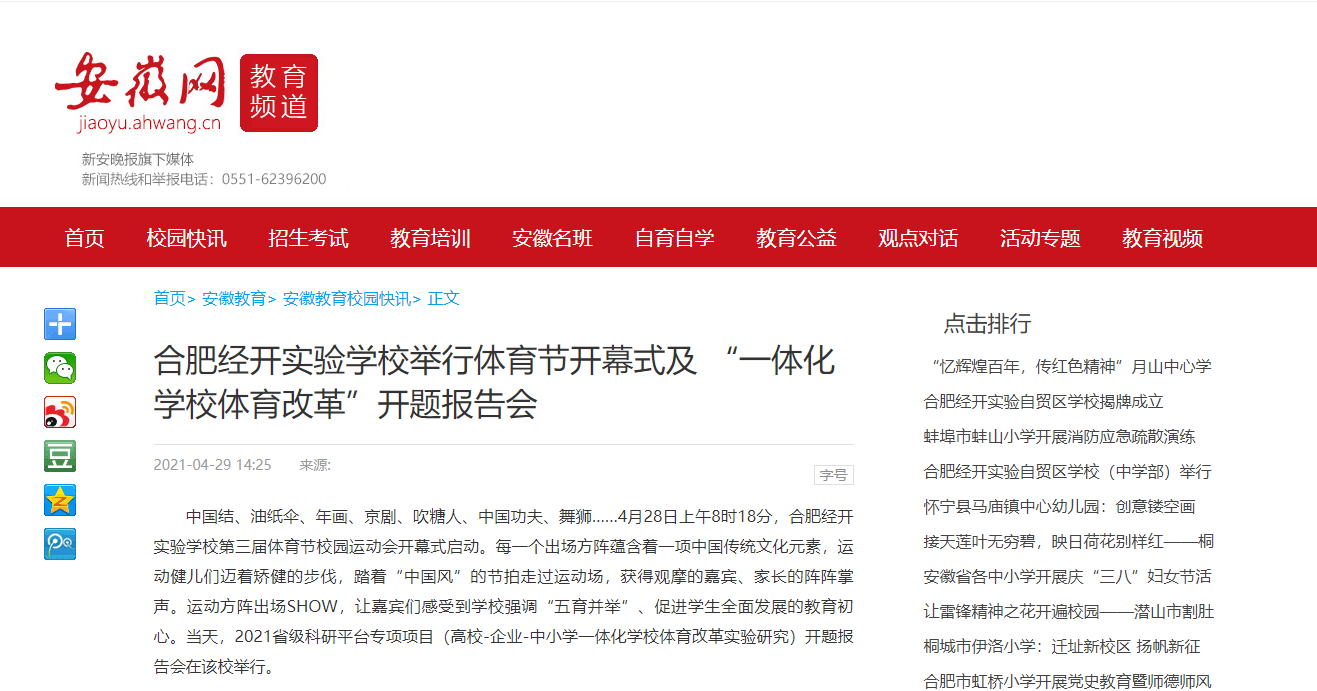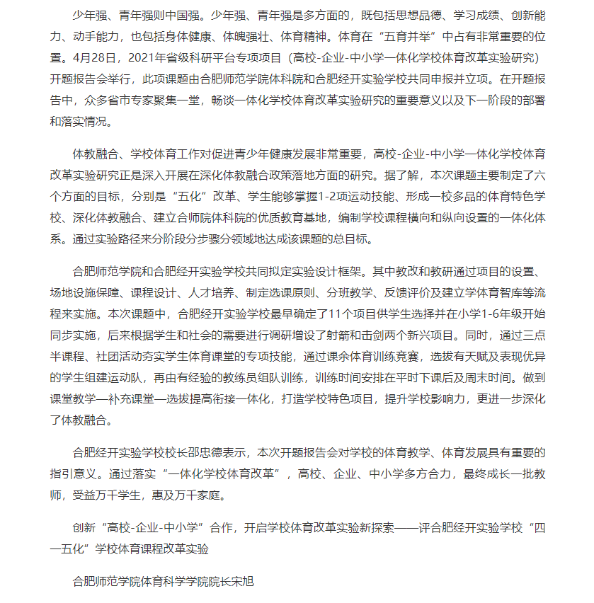 本网讯 少年强、青年强则中国强。少年强、青年强是多方面的,既包括思想品德、学习成绩、创新能力、动手能力,也包括身体健康、体魄强壮、体育精神。体育在“五育并举”中占有非常重要的位置。4月28日上午,2021年省级科研平台专项项目(高校-企业-中小学一体化公司体育改革实验研究)开题报告会在合肥经开区实验公司举行,此项课题由william威廉中文官网和合肥经开实验公司共同申报并立项。