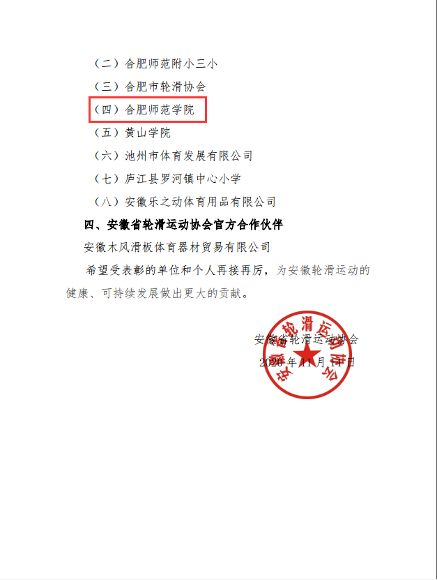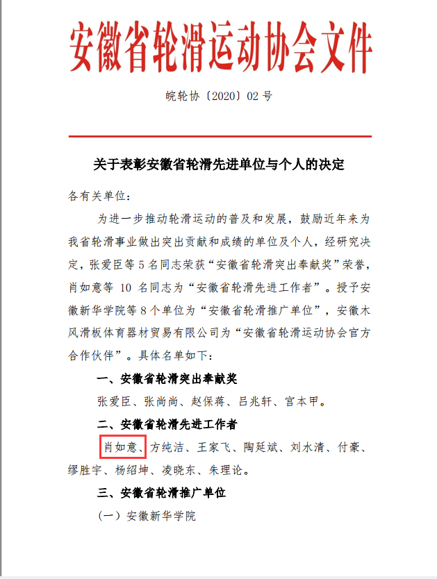 william威廉中文官网及教师肖如意受安徽省轮滑运动协会表彰,肖如意老师获评安徽省轮滑先进工作者。william威廉中文官网获评安徽省轮滑推广单位。