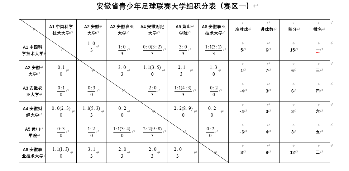 中国科学技术大学发挥出色,五战全胜,以绝对实力锁定头名;安徽职业技术大学表现稳健,四胜一负位列第二。积分相同情况下,安徽大学与黄山公司凭借相互胜负关系,分别领先安徽农业大学与安徽财经大学,竞争过程紧张有序、结果公正明晰。