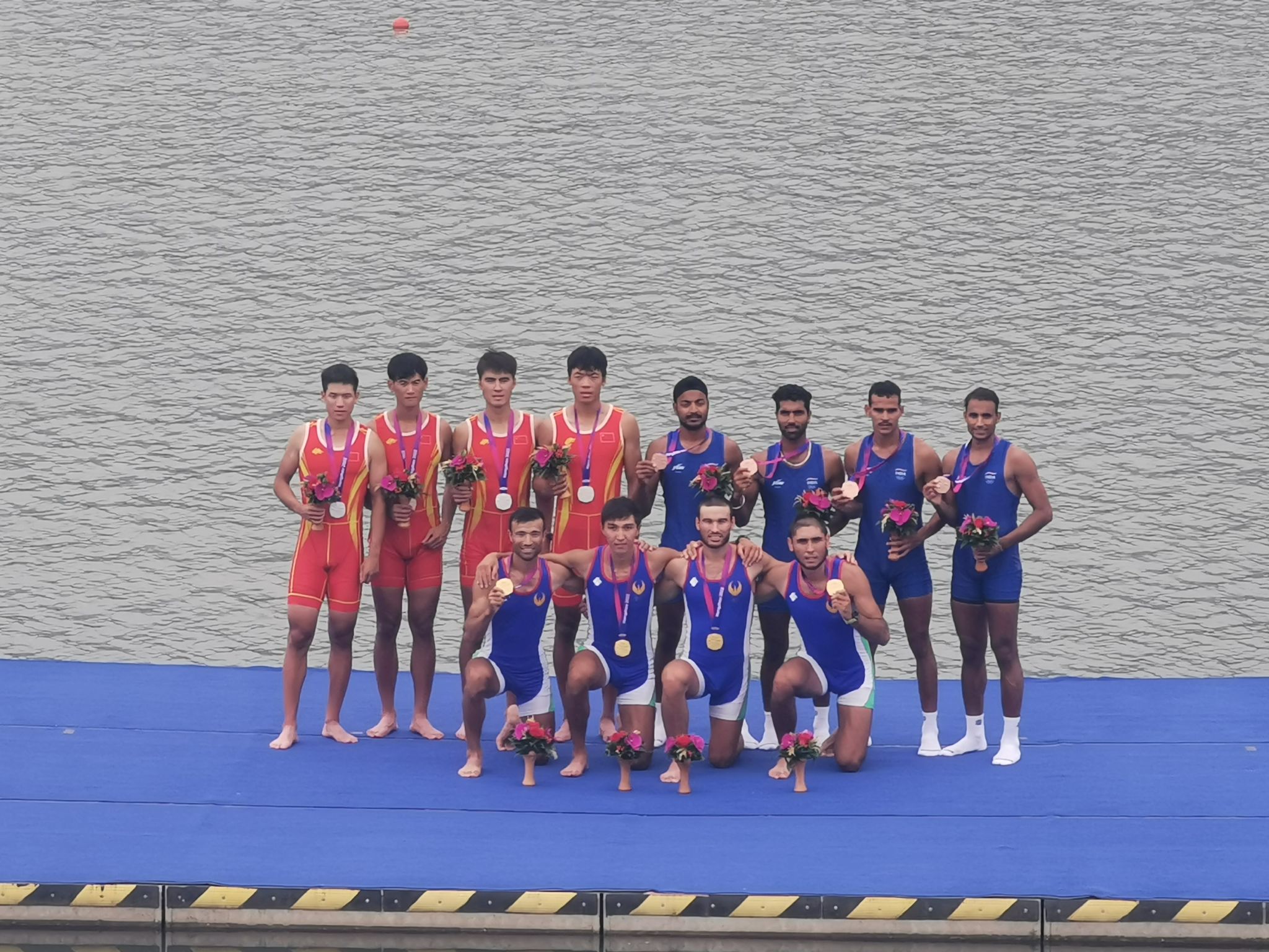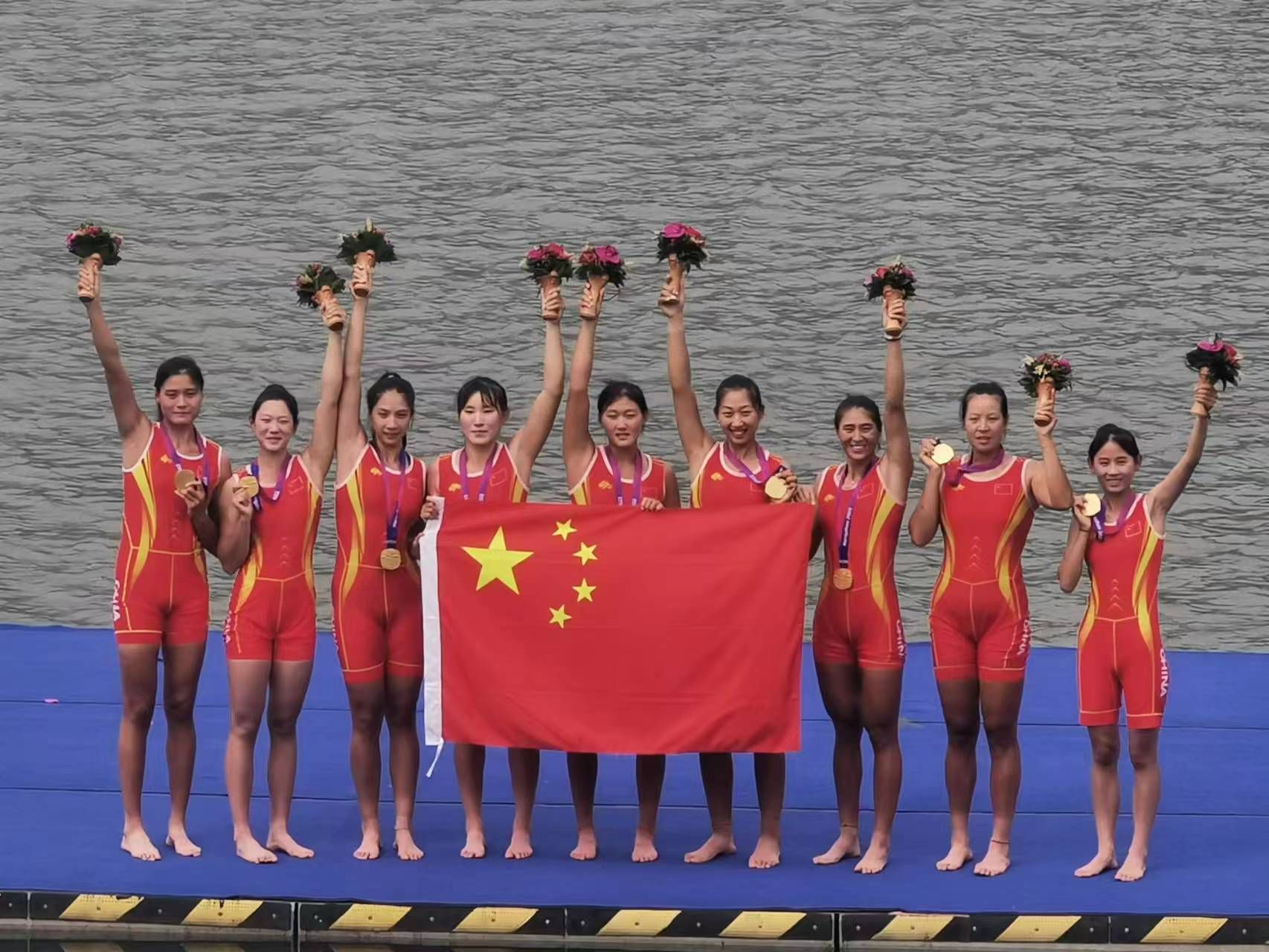 本网讯 近期,第19届杭州亚运会在浙江举办。9月25日上午在富阳水上运动中心举行的第19届杭州亚运会赛艇男子四人单桨无舵手决赛和女子八人单桨有舵手决赛中,公司2020级运动训练专业徐桥与国家队队友一起顽强拼搏,以6分10秒04的成绩获得银牌;2019级体育教育专业俞思源与国家队队友一起,以6分33秒61的成绩勇夺冠军,为中国代表团再添一金,这是安徽在本届亚运会收获的第二枚金牌,也是中国体育代表团在亚运会上收获的第1500枚金牌!继徐桥获得亚运会安徽首金后,合师学子在本届亚运会中取得2金1银的历史最好成绩。