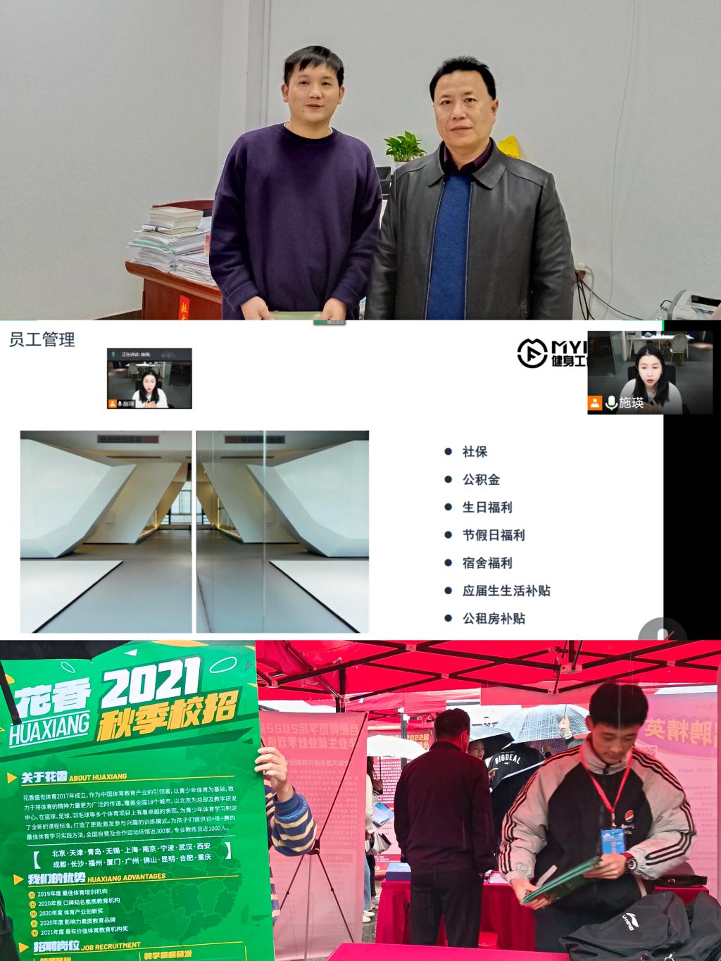 线上线下,组合发力。积极配合公司秋季双选会布展组织的同时,与省外的企事业单位杭州MYFIT健身工作室对接,通过组织腾讯会议线上招聘宣讲会,员工不出校门就能了解一些体育对口方向就业市场、招聘需求等,进一步对标提高竞争意识,做好求职择业准备。
