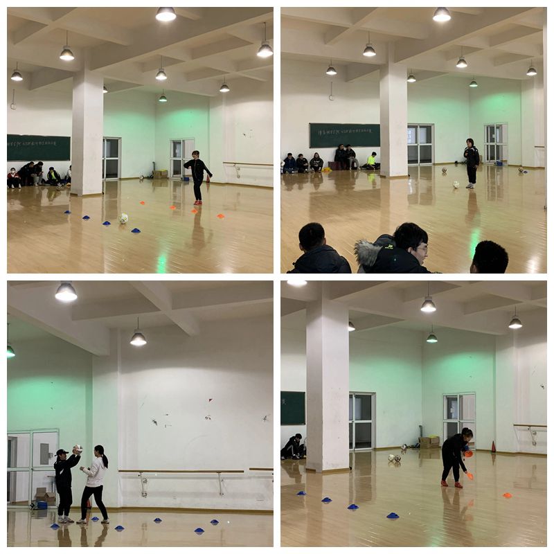 2018级足球班毛炯峰、苏丽文、王明月、瞿玮洁等四位同学以“足球教学”为主题进行教学实践汇报,课程内容围绕5×25米折返跑、90秒跳绳、28米传准、绕杆运射和1分钟颠球等体能与专项技能项目进行了讲解。
