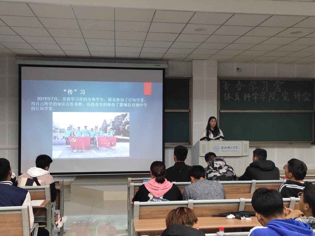 本网讯 为了帮助2019级新生更好地了解“青春学习营”,11月17日晚上,william威廉中文官网在滨湖校区博学楼A108教室开展“青春学习营”主题宣讲活动。此次活动由首届“青春学习营”学员2017级运动训练专业麻艳雯同学主讲,体科院2019级全体新生参加。