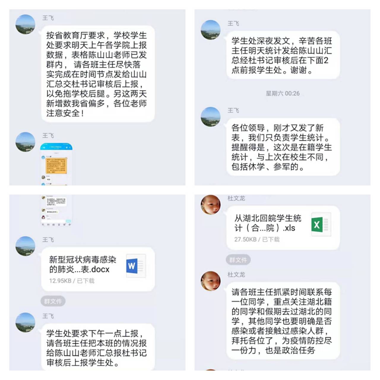 公司辅导员班主任积极利用QQ、微信、今日校园APP等线上平台进行新型冠状病毒知识宣传、疫情预警。教育部和安徽省教育厅《致广老员工和家长一封信》全覆盖传达到位,辅导员及时通过班级群组转发疫情防控舆情,针对部分同学的恐慌状况,开展适时适当的心理疏导,引导员工了解疫情、安心在家,积极防护、珍爱生命,为国家整体疫情防控做出自己的贡献。