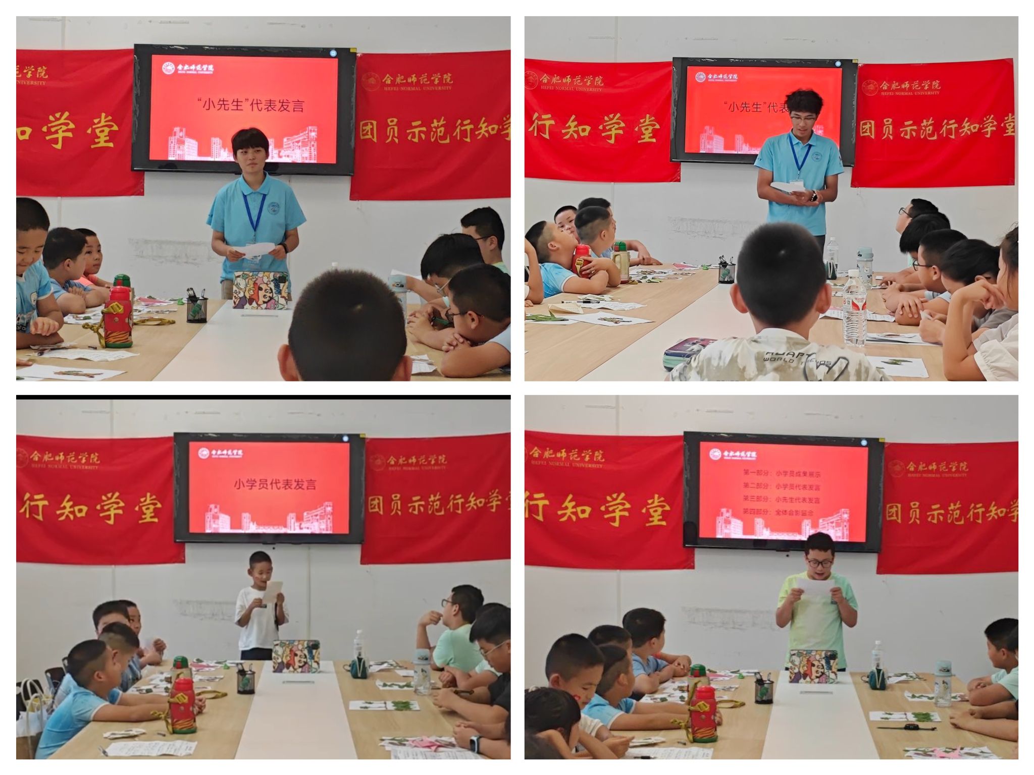 小学员代表朱德镕、胡乐语走上台前,用稚嫩而真挚的语言分享了在“行知学堂”的学习收获与快乐时光,表达了对“小先生”们辛勤付出的感激和对学堂生活的不舍。“小先生”代表邹雨孜、夏影晶则分享了教学过程中的点滴感悟。看到小学员们的成长与进步,她们感到无比欣慰与自豪,并表示这段珍贵的经历将成为人生中难忘的回忆。