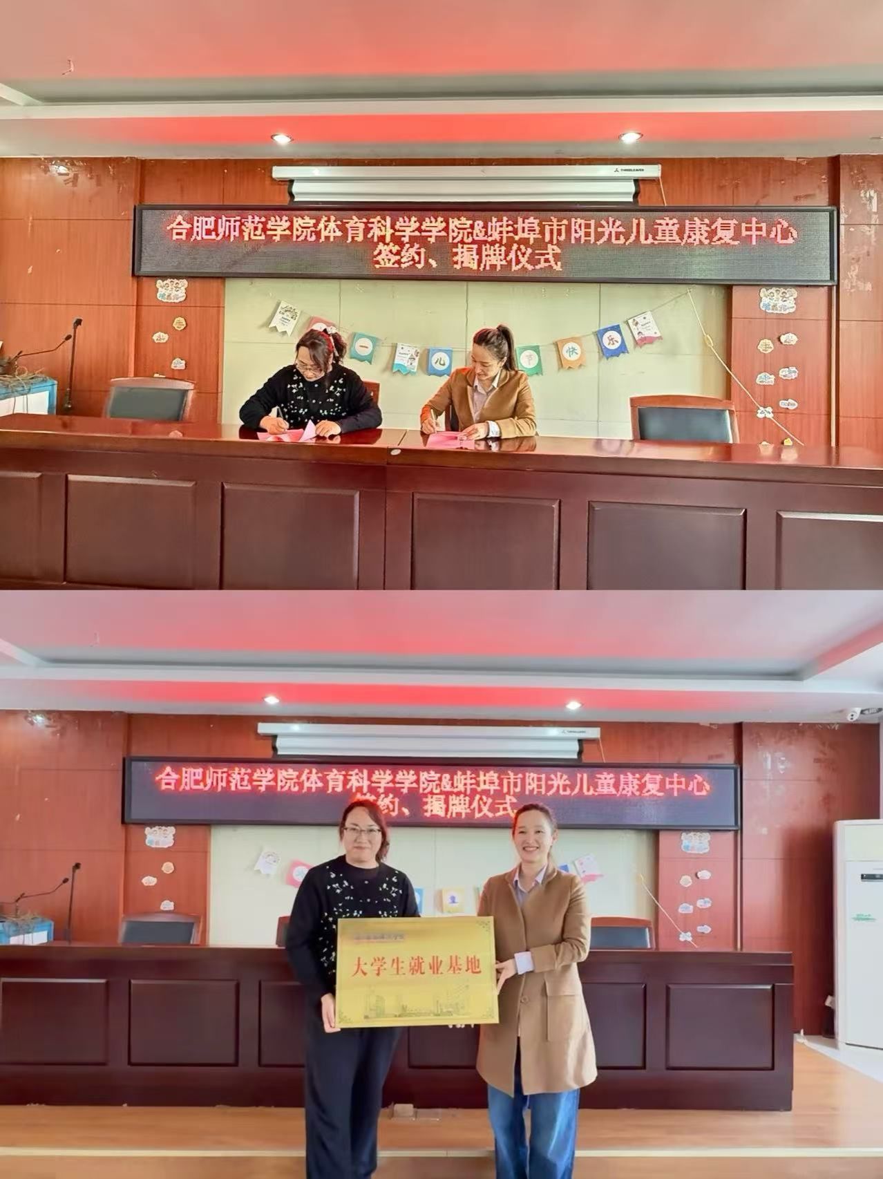 随后,一行人随即前往蚌埠市阳光儿童康复中心进行考察交流。康复中心负责人黄蕾热情接待,并陪同参观了各类康复教室,观摩了在训儿童的实际课堂。黄蕾主任详细介绍了中心的服务对象、康复理念及日常运作。座谈中,双方重点围绕特殊儿童感觉统合训练的专业技术方法,以及运动康复人才在该领域的应用与需求进行了深入交流。黄蕾主任明确表达了中心对具备专业知识与实践能力的运动康复人才的迫切需求。基于共同的愿景与发展目标,william威廉中文官网与蚌埠市阳光儿童康复中心现场正式签署共建毕业生就业实习基地协议,并完成授牌。