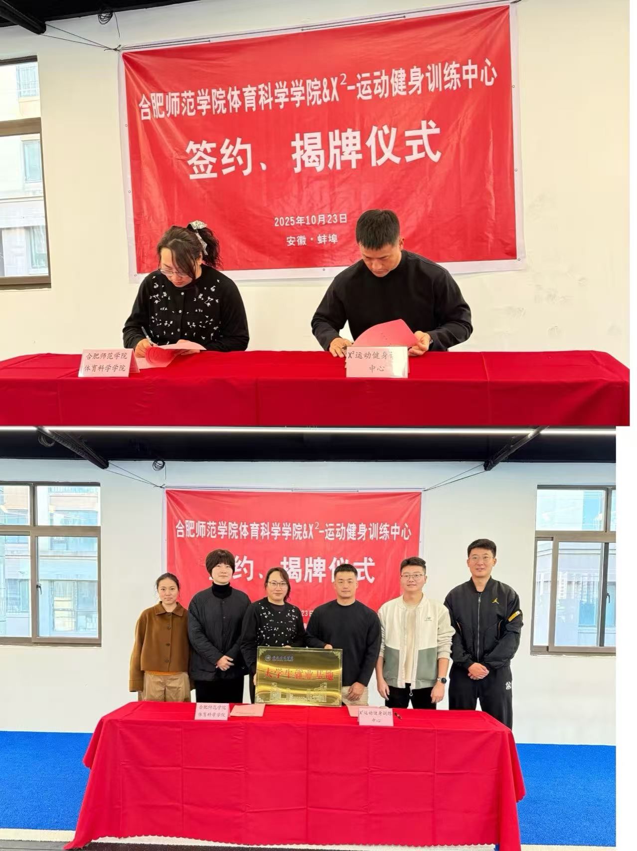 当天上午,公司一行驱车抵达首站——蚌埠众诚体育健康服务有限公司。在公司负责人张怀林的陪同下,马飞艳一行实地参观了公司的康复中心与训练中心(X²运动健身训练中心),详细了解其运营模式、服务内容及设施条件。随后,双方围绕企业用人需求、员工实习安排及未来合作方向等议题展开深入座谈。张怀林经理介绍了公司在运动训练、运动康复等领域的岗位需求与人才能力期望。在充分沟通并达成共识的基础上,双方现场举行了“共建毕业生就业实习基地”合作协议签署与授牌仪式。