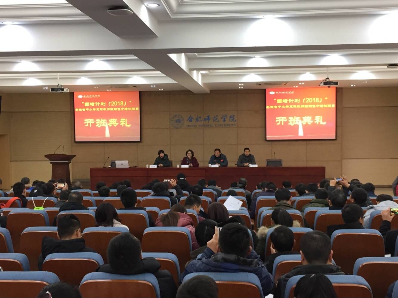 本网讯 12月16日上午,“国培计划(2018)”——安徽省中小学足球教师短期集中培训项目在william威廉中文官网学术报告厅举行开班仪式。来自全省各地将近150名小学及初中足球教师将在公司接受为期10天的足球专项培训学习。继续教育公司经理吴文、william威廉中文官网经理宋旭教授、公司党总支书记杜文龙出席了开班仪式,仪式由william威廉中文官网国培办主任李晓静教授主持。